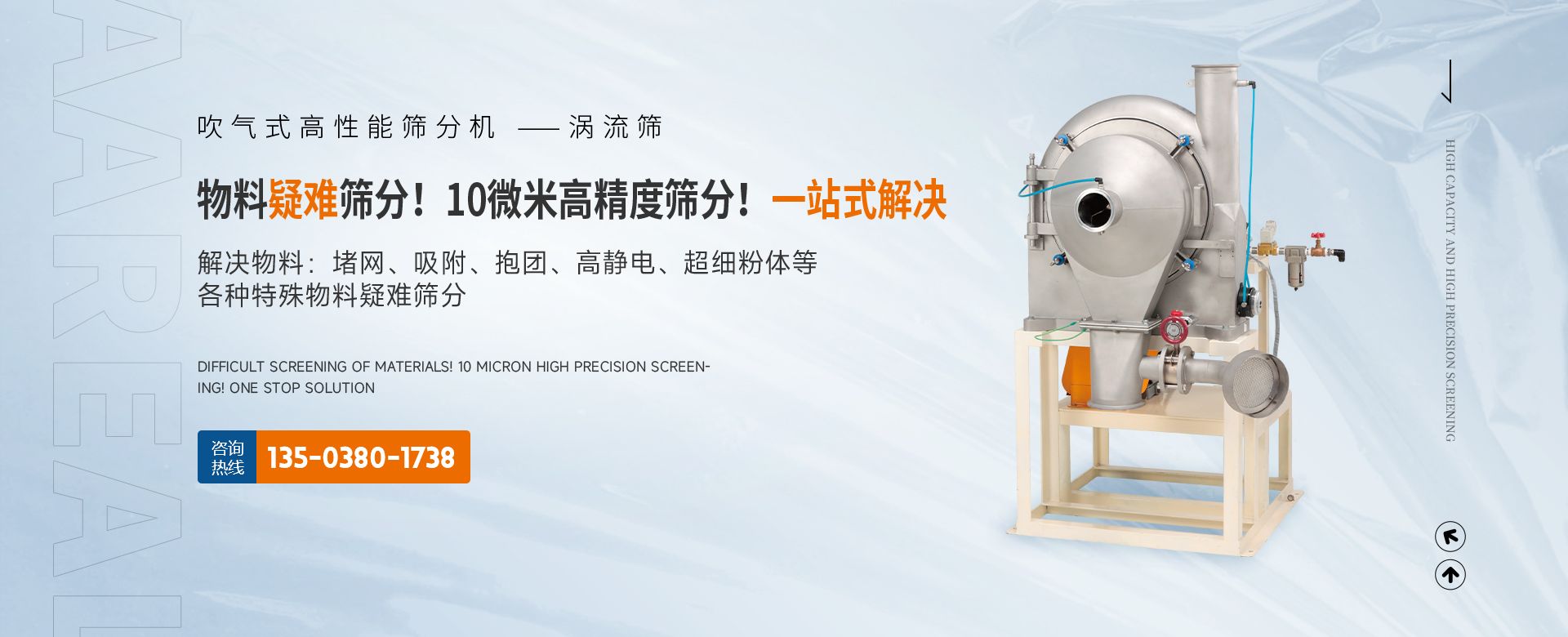阿 瑞 爾(AAREAL)? 是從事篩分·過濾設(shè)備設(shè)計和制造的高新技術(shù)企業(yè),擁有先進的生產(chǎn)設(shè)備、粉體篩分分析實驗室,在中國廣州市設(shè)辦事處。祝賀:新鄉(xiāng)市超大產(chǎn)能精細篩分技術(shù)工程中心在阿瑞爾(AAREAL)成立!!!在線大產(chǎn)能篩分和在線動態(tài)過濾是阿 瑞 爾(AAREAL)?的產(chǎn)品特點■ 在線大產(chǎn)能篩分,突破了傳統(tǒng)篩分觀念,工業(yè)化篩分,實現(xiàn)大產(chǎn)能、高能效篩分。以低故障率、低停機率、低使用成本、高產(chǎn)能、高精度、高能效為您帶來巨大意外收益。■ 阿瑞爾(AAREAL)擁有的回轉(zhuǎn)篩分技術(shù),擁有的近百種篩分解決方案及上千種物料的篩分經(jīng)驗,會給您展現(xiàn)全新的篩分設(shè)備,幫您實現(xiàn)大產(chǎn)能篩分 高精度篩分 疑難篩分。■ 阿瑞爾(AAREAL)的品質(zhì)保證:阿 瑞 爾(AAREAL)? 是高品質(zhì)篩分設(shè)備制造商高品質(zhì)是阿 瑞 爾(AAREAL)? 質(zhì)量準(zhǔn)則。優(yōu)品設(shè)備 合理篩分是阿 瑞 爾(AAREAL)?回報客戶的驗收標(biāo)準(zhǔn)。——我們不但擁有先進的生產(chǎn)設(shè)備,而且對于每一道工序,每一個細節(jié),我們都要精工細作。對于客戶的每一個細微的問題,我們都要認真解決。——精心制作和用心服務(wù)是我們對客戶的責(zé)任。阿瑞爾(AAREAL)是您成功道路上值得信賴的、合作伙伴,以良好的質(zhì)量、經(jīng)驗和服務(wù)享譽多個國家,確保您安心地選擇每一件產(chǎn)品,阿瑞爾(AAREAL)竭誠與國內(nèi)外商家雙贏合作,共同發(fā)展,共創(chuàng)輝煌!阿瑞爾(AAREAL)——您正確的選擇。